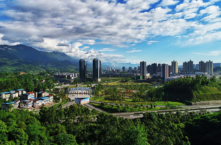位于华蓥山下的华蓥市在蓝天白云和绿树的映衬下,显得格外美丽祥和